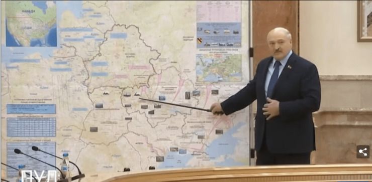 Alexandre Loukachenko s’est adressé aujourd’hui à des responsables de la sécurité alors qu’il se tenait devant une carte de combat qui semble montrer une opération planifiée depuis le sud de l’Ukraine vers son petit voisin.