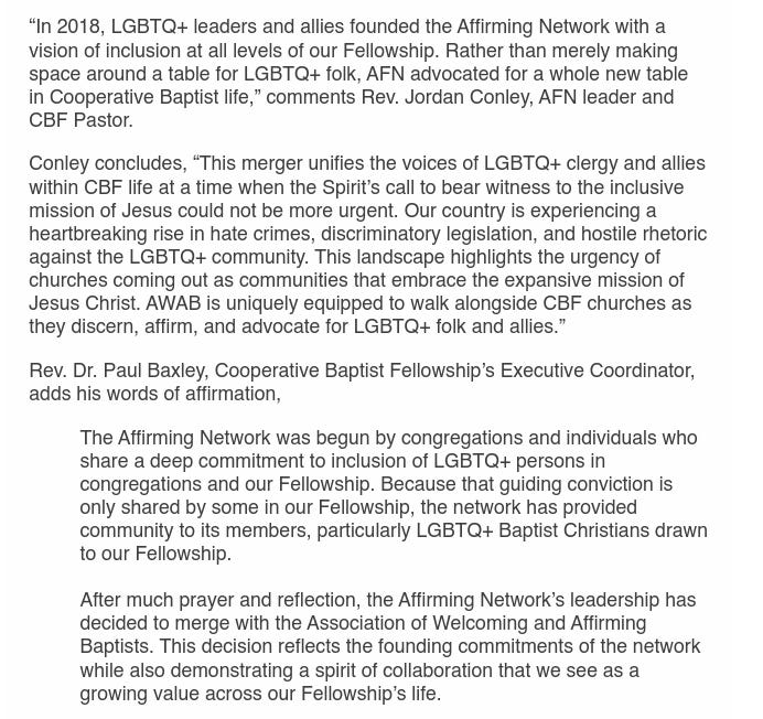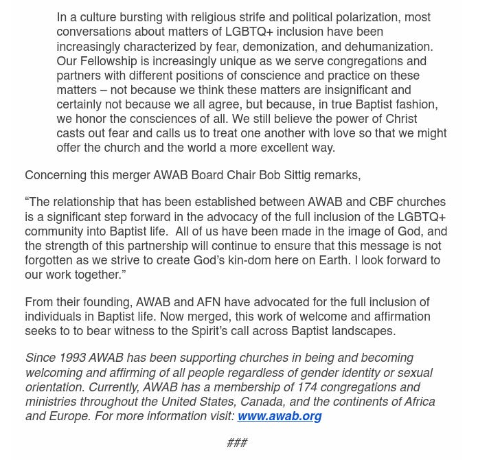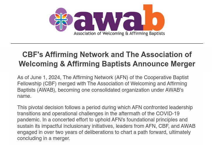 Voici un courriel récent envoyé par l’Association des Baptistes Accueillants et Affirmants (AWAB), une division de la CBF, qui démontre à quel point cette organisation est allée sur la même trajectoire que d’autres dénominations apostates telles que l’Église Méthodiste Unie et le PCUSA :