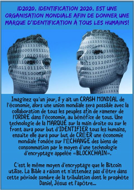 Imaginez qu’un jour, il y ait un crash mondial de l’économie, alors une union mondiale sera possible avec la collaboration de tous les peuples afin de ramener de l’ordre dans l’économie, au bénéfice de tous. Une technologie de la marque sur la main droite ou sur le front aura pour but d’identifier tous les humains, ensuite elle aura pour but de créer une économie mondiale fondée sur l’échange des biens de consommation par le moyen d’une technologie d’encryptage appelée «BLOCKCHAIN».