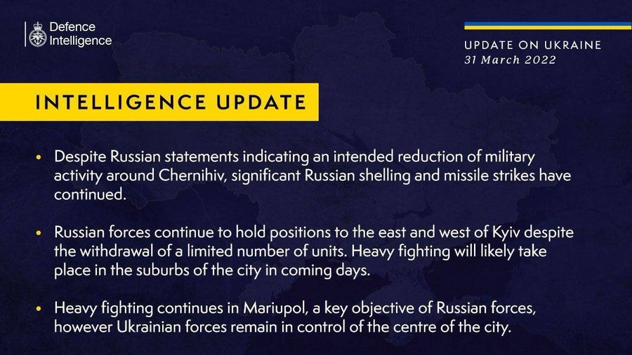 Les services de renseignement britanniques écrivent que la Russie maintient des positions à l’est et à l’ouest de Kiev, malgré le fait que certaines unités se soient retirées de ces zones.