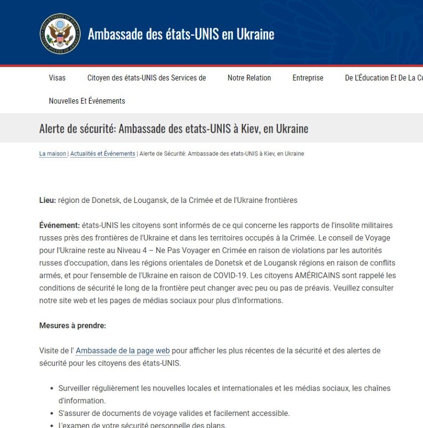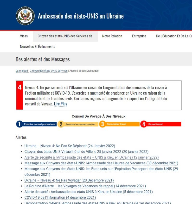 De l’appel du Département d’État : « Étant donné que le président a déclaré qu’une action militaire de la Russie pourrait survenir à tout moment. Le gouvernement américain ne sera pas en mesure d’évacuer les citoyens américains. Les citoyens américains actuellement présents en Ukraine doivent donc s’organiser en conséquence. » Organisez des vols commerciaux.